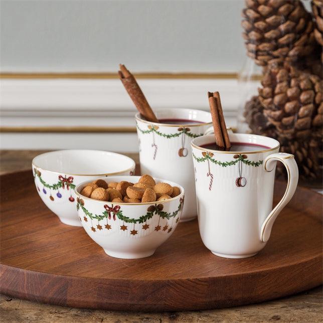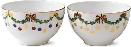 Dette sæt af to Stjerne Riflet Jul Skåle på 30 cl er en oplagt julegaveidé eller særlig tilføjelse til en personlig samling af Royal Copenhagen. Skålene har hver sin unikke dekoration med guldstjerner og julekugler på yndige granguirlander. Fyld skålene med juleknas, tranebærsovs eller andre af julens lækkerier og tilføj lidt ekstra julemagi til det veldækkede julebord. Blandt julens smukke traditioner hører julestellet fra Royal Copenhagen. På tallerkener, skåle og kopper snor granguirlanderne sig højtideligt, dekoreret med elegante silkesløjfer og den fineste julepynt. Stjerne Riflet Jul skaber stemning og gør julen til noget helt særligt – generation efter generation. Hver eneste steldel er et smukt stykke julepynt i sig selv, og når bordet står dækket og lysene er tændt, så bliver det helt sikkert jul igen.