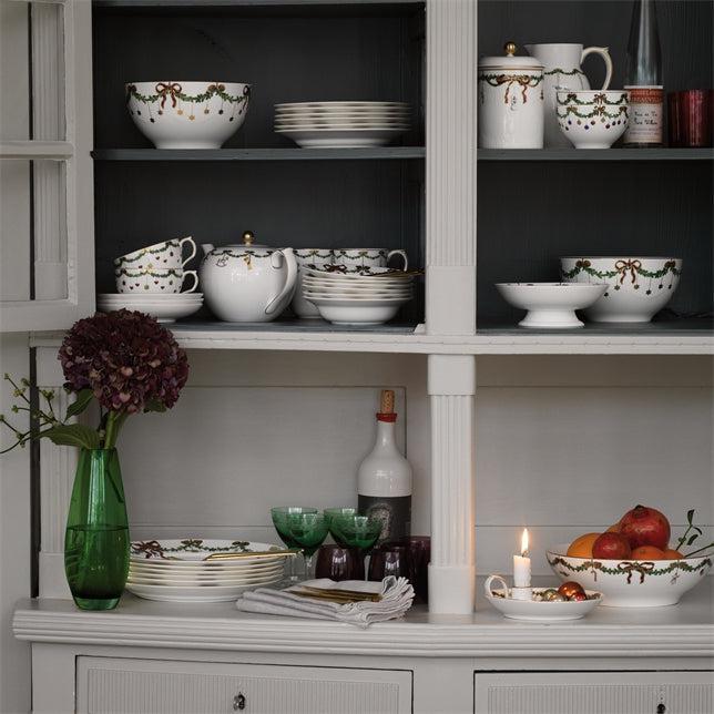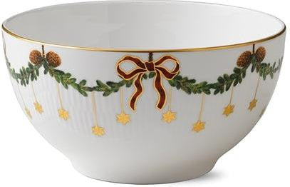 Det elskelige mønster fra Stjerne Riflet Jul pryder denne alsidige skål med delikate guldstjerner og fine røde sløjfer, som er bundet sirligt omkring det stedsegrønne gran. Skålen på 180 cl er ideel som serveringsskål til juleknas og tilbehør ved det store julebord. Blandt julens smukke traditioner hører julestellet fra Royal Copenhagen. På tallerkener, skåle og kopper snor granguirlanderne sig højtideligt, dekoreret med elegante silkesløjfer og den fineste julepynt. Stjerne Riflet Jul skaber stemning og gør julen til noget helt særligt – generation efter generation. Hver eneste steldel er et smukt stykke julepynt i sig selv, og når bordet står dækket og lysene er tændt, så bliver det helt sikkert jul igen.