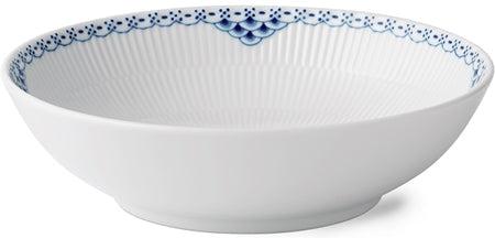 Denne enkle Skål på 110 cl fra Prinsesse-stellet er håndmalet med stellets klassiske blondekant, der elegant snor sig langs skålens kant, hvor den mødes af fine, håndlavede rifler. Porcelænsskålen kan være udgangspunktet for en romantisk borddækning, og den er også nyttig som en dyb tallerken.