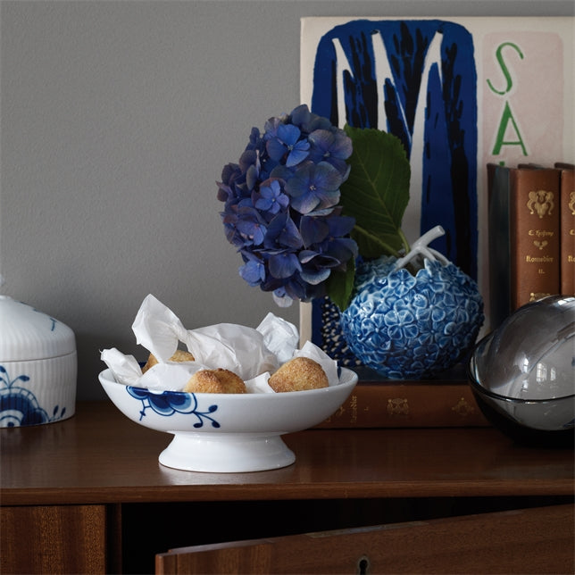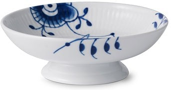 Denne lille Blå Mega Riflet Skål på fod med en højde på 6 cm er ideel som serveringsskål til små sideretter eller blot som et smukt element i hjemmet. Skålen prydes af håndmalede blomster og palmetter der elegant snor sig om porcelænsskålens sider i et forstørret udtryk. Blå Mega Riflet er på en gang velkendt og forfriskende. Stellet er født af en modig nyfortolkning af det ikoniske Musselmalet Riflet og fortryller med sine grafiske og forstørrede sektioner af det musselmalede mønster. Siden Blå Mega Riflet blev designet i 2000 er stellet vokset sig til en ny klassiker inden for dansk design, og det iøjnefaldende stel er smukt i sig selv og i kombination med særkollektionen Mega Rose eller andre Royal Copenhagen stel.