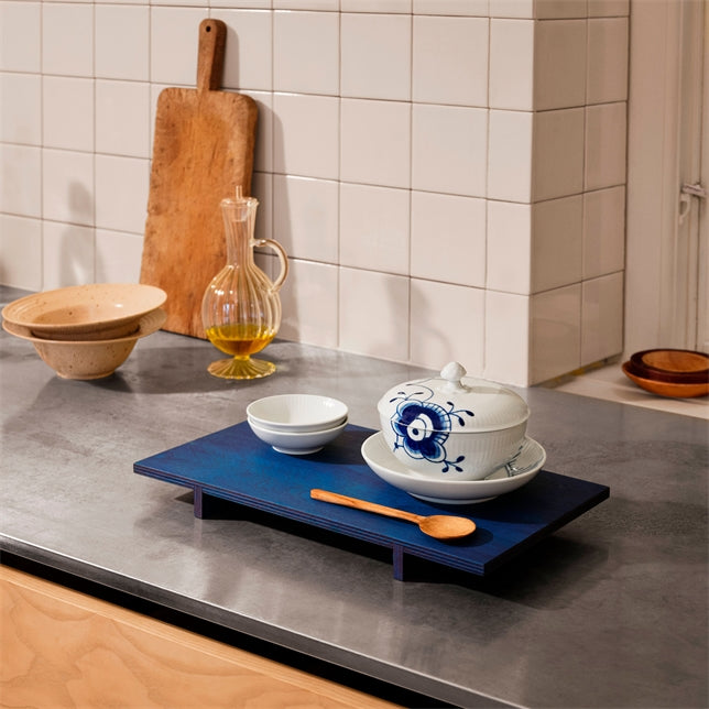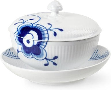 Den Blå Mega Riflet skål med låg og underkop fås i ét praktisk sæt. Ideel til en mindre portion suppe til hver en gæst eller andre små retter. Med de håndmalede dekorationer, der organisk pryder skål og låg er dette tredelte stykke porcelæn en særlig tilføjelse til den Mega Riflet kollektion.