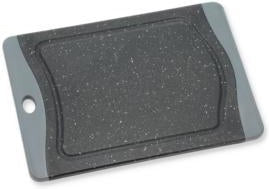 Skærebræt med kant i gråt gummi med anti-skrid-funktion. 20 x 14 x 0,8 cm. De skridsikre ender gør, at brættet ligger stabilt på bordet. Skærebrættet er forsynet med saftriller. Nemt at rengøre. Skærebrættet er fremstillet med en skæreflade i PP plast og en kant i TPE gummi.