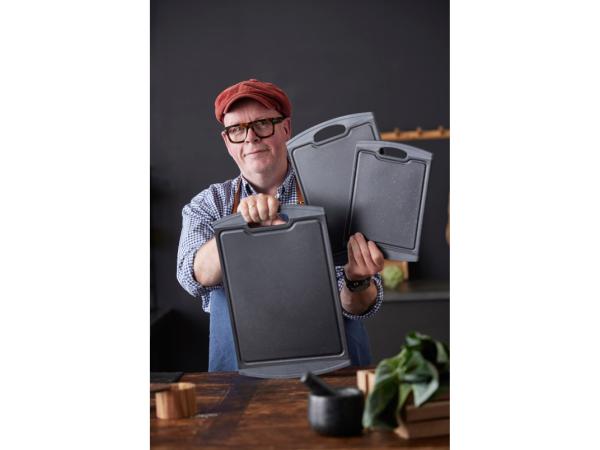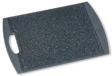 Skærebræt med kant i gråt gummi med anti-skrid-funktion. 36,8 x 25,4 x 1 cm. De skridsikre ender gør, at brættet ligger stabilt på bordet. Skærebrættet er forsynet med saftriller. Nemt at rengøre. Skærebrættet er fremstillet med en skæreflade i PP plast og en kant i TPE gummi.