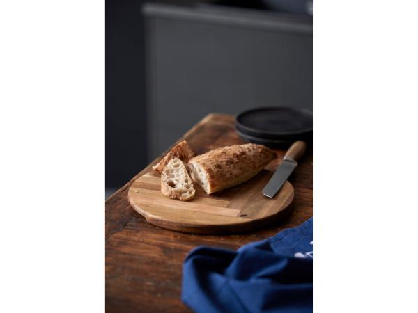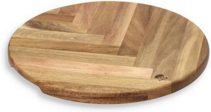 Rundt serveringsbræt af akacietræ i flot sildebensmønster. Brug det flotte serveringsbræt til servering af pizza, pålæg, bruschetta og andre antipasti-retter, ost eller andre retter, der skal præsenteres flot. Dia. 30,5 cm.