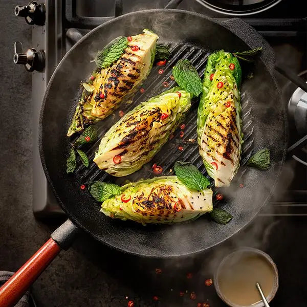 Skarpe kanter "svier" ind i maden, hvilket resulterer i en lækker char grillet smag med karakteristiske striber