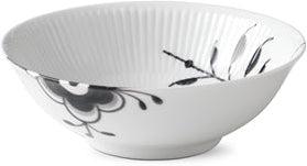 Denne lille skål i Sort Mega Riflet er håndmalet med en smuk blomst og palmette i nuancer af sort og grå. I modsætning til de større skåle i stellet, er de taktile rifler placeret på skålens inderside, hvilket skaber et kontrastfyldt udtryk, når skålen kombineres med andre serveringsdele fra Sort Mega Riflet. Porcelænsskålen rummer 35 cl og er nyttig som morgenmadsskål og til små serveringer. Sort Mega Riflet er et smukt bevis på, at selv de mest klassiske traditioner kan tåle at blive udfordret – med skønhed som resultat. Stellets karakteristiske mønster af sorte og grå håndmalede nuancer indkapsler en dramatisk, monokrom kontrast til de hvide porcelænsoverflader. I Royal Copenhagens blå univers er Sort Mega Riflet et strejf af sofistikeret coolness.
