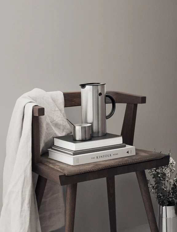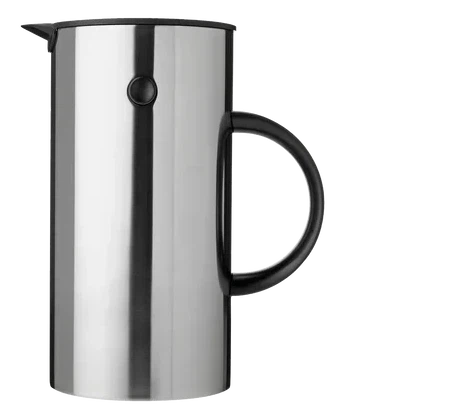 EM77 termokanden i stål på 0,5 liter, designet af Erik Magnussen i 1977, er med sin unikke vippeprop et designikon, kendt og elsket over hele verden. Kanden kan anvendes til kaffe og te og den isolerende glasindsats sikrer, at drikken holder sig varm i mange timer - eller kold, hvis kanden bruges til fx iste. Udover vippeproppen medfølger også et picnic skruelåg, så kanden let kan transporteres med indhold.