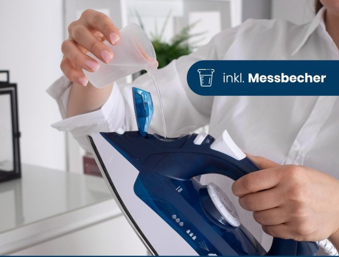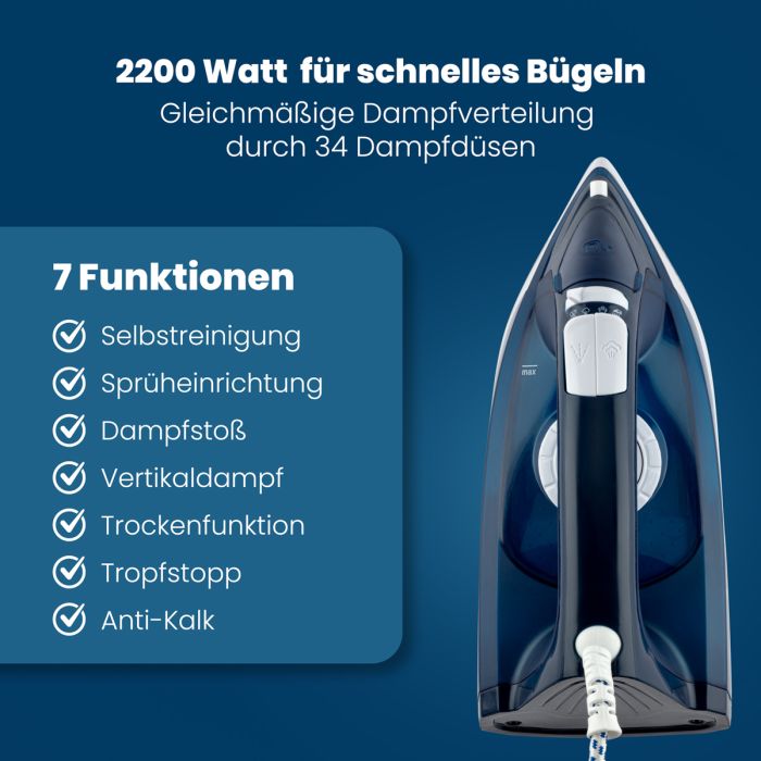 - 7 functions: – Spray device – Steam jet function – Vertical steam – Dry function (steam can be switched off) – Self-cleaning function (switchable) – Anti drip function – Anti-calc filter system