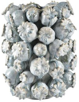 Virkelig flot og skulpturel stentøjsvase, der både er imponerende med en stor buket blomster og som en dekoration i sig selv. Vasen er dækket med smukke figurer formet som valmuefrøstande, disse er formet og sat på i hånden.
